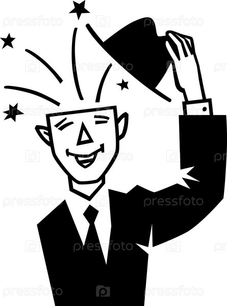 Искрометный человек, фигура в деловом костюме снимает шляпу в приветствии, черно-белый вариант
