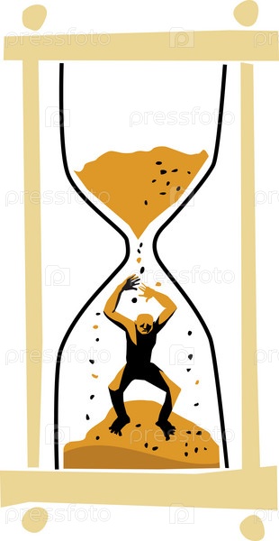 Песочные часы в фигурой человека внутри, на голову которого падает песок, метафора времени