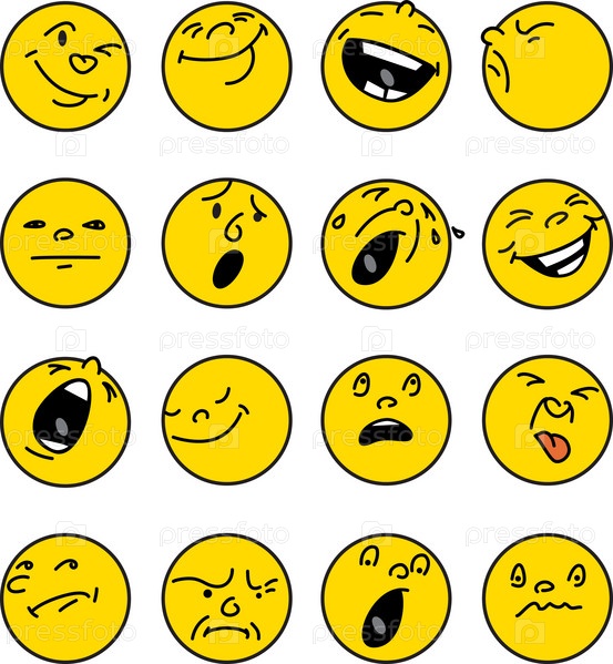 Желтые плоские круглые смайлики с разными динамичными эмоциями