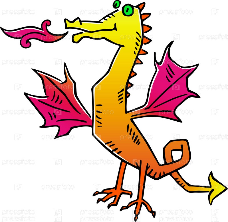 Веселый крылатый оранжевый дракончик, пышущий огнем