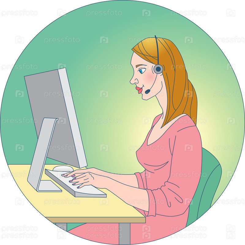 Молодая женщина в розовом платье и наушниках работает за компьютером