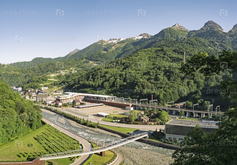 Курорт Роза Хутор и железнодорожная станция в Эсто-Садоке с горным массивом Аибга. Курорт Красная поляна в Сочи, Россия