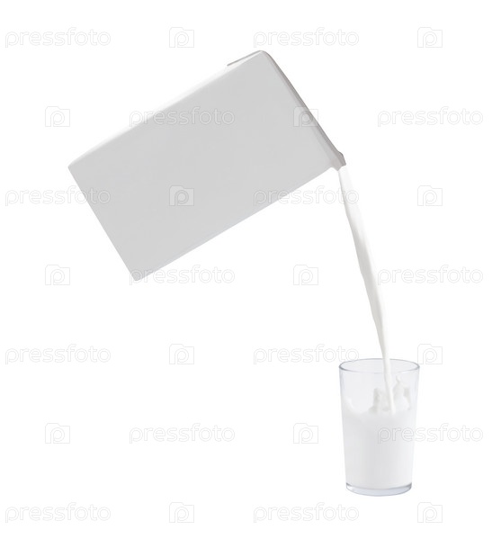 Молоко, вытекающее из картонной упаковки в стакан, изолированное на белом фоне