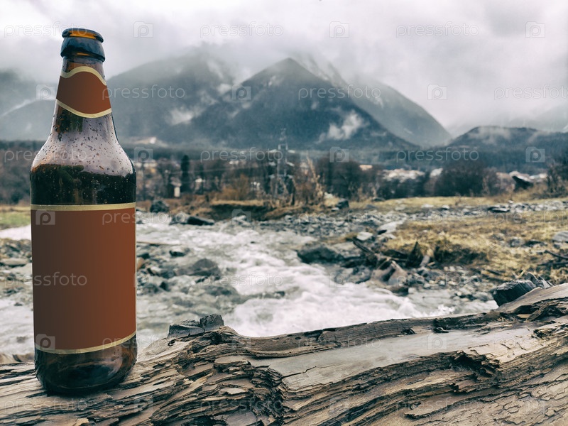 Бутылка пива с каплями воды на фоне гор и реки
