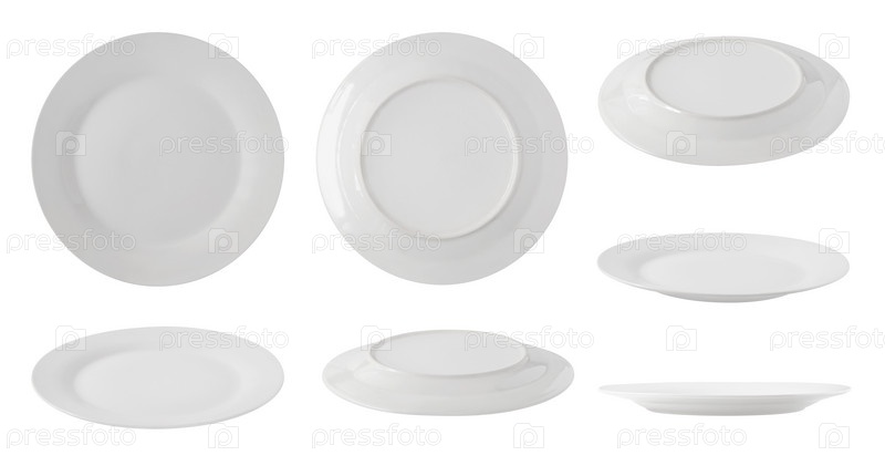 Набор видов сверху, сбоку и сзади белых пустых тарелок, изолированных на белом