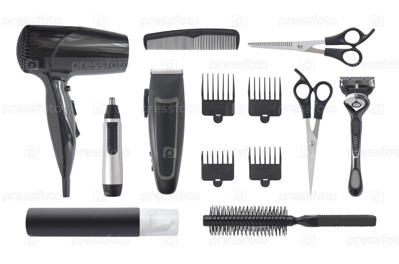 Вид сверху на профессиональную прическу и набор для ухода на белом фоне. Машинка для стрижки волос, фен, расчески и другой парикмахерский инвентарь