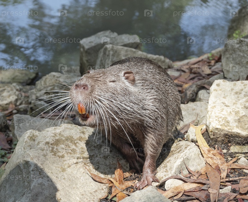 Нутрия или нутрия с оранжевыми зубами на фоне реки