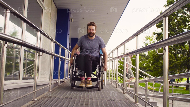 Инвалид в инвалидной коляске спускается по склону