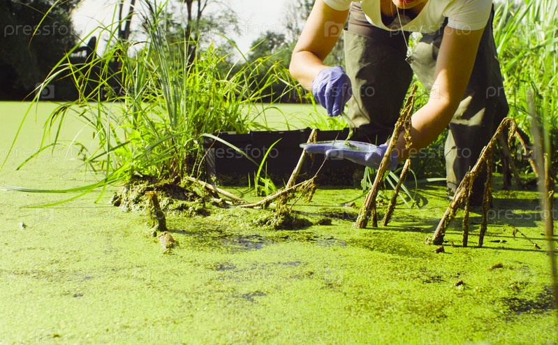 Руки женщины-эколога берут образцы ряски