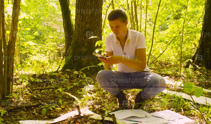 Женщина-эколог стреляет в растения в лесу