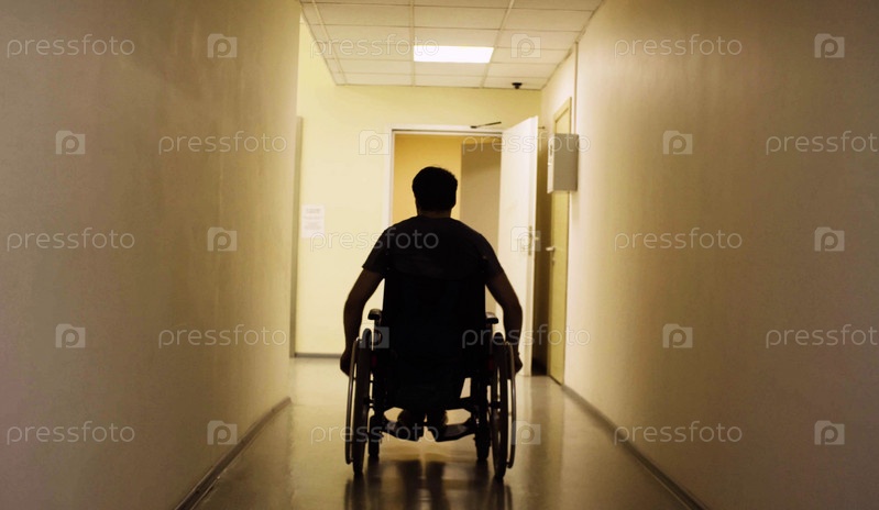 Силуэт инвалида в инвалидной коляске в реабилитационном центре