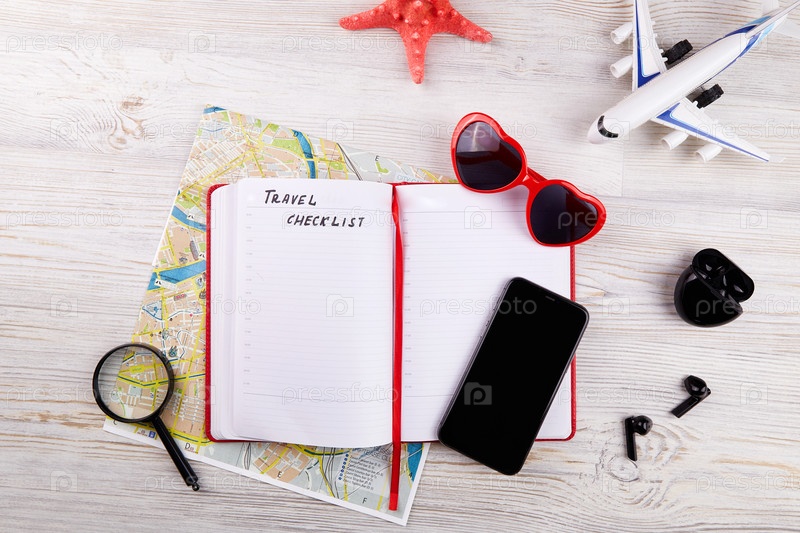 Карта, телефон, открытый блокнот для списка дел и другие дорожные принадлежности