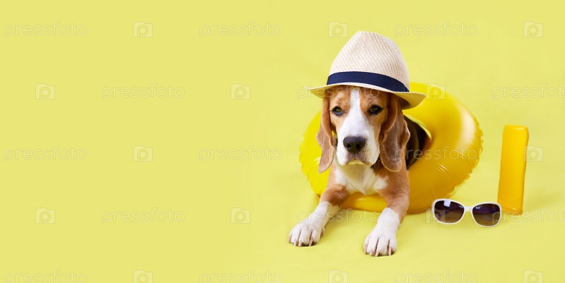 Лежащая собака-бигль в соломенной шляпе и надувном круге для плавания