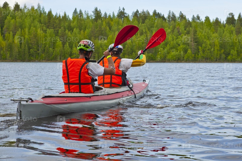 Каякинг. Два гребца на озере в лесу