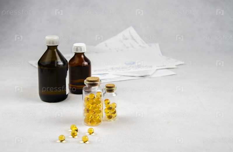 Таблетки и лекарства на столе. Прозрачная бутылка и капсулы
