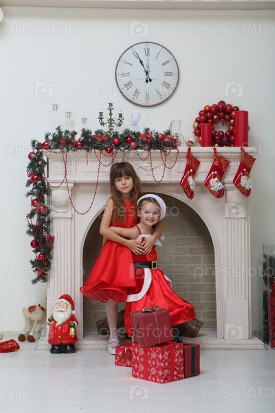 Две маленькие девочки в красивых нарядах возле камина