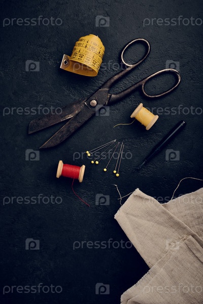 Плоская планировка швейных принадлежностей - ножницы старых портных, деревянные катушки с нитками, вспарыватель швов и льняная ткань, черный фон, место для текста
