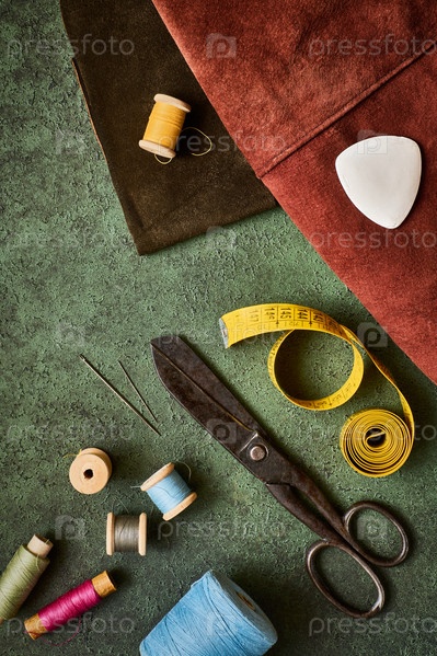 Швейные принадлежности, старинные ножницы, катушки с нитками и портной метр на зеленом текстурированном фоне, плоская планировка