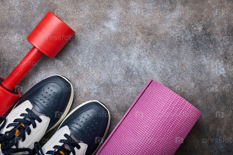 Кроссовки, гантели и коврик для упражнений, концепция здорового образа жизни