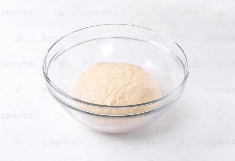 Дрожжевое тесто в стеклянной миске на белом столе. Техника расстойки выпечки