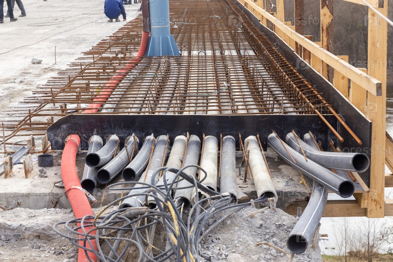 Восстановление городского моста. Проложены новые арматурные обвязки, а также кабели и другие коммуникации, защищенные пластиковыми кожухами. Участок подготовлен к бетонированию