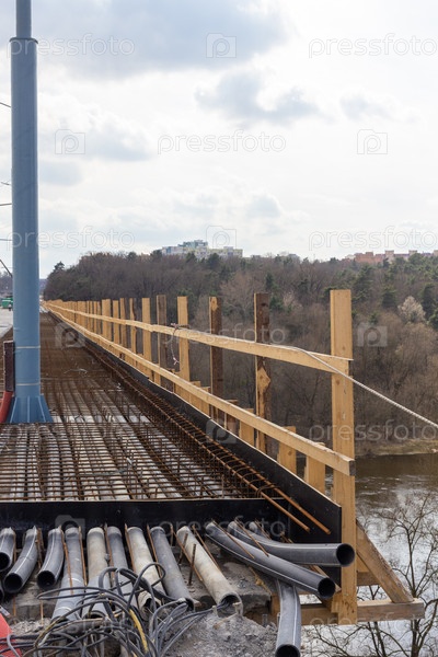 Восстановление городского моста. Проложены новые арматурные обвязки, а также кабели и другие коммуникации, защищенные пластиковыми кожухами. Участок подготовлен к бетонированию