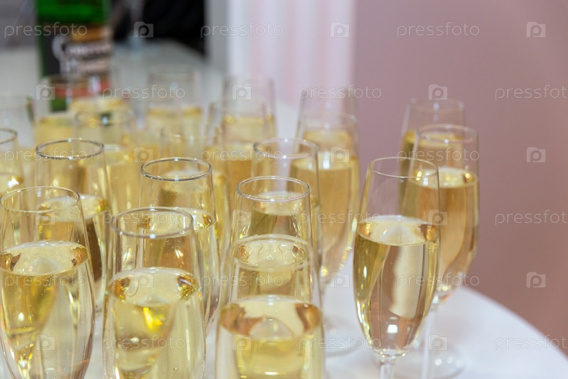 Элегантные бокалы с охлажденным шампанским стоят в ряд