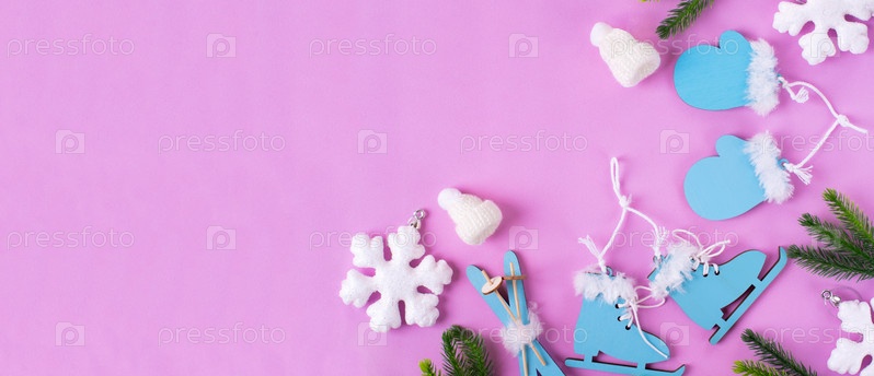 Веб-баннер с зимней плоской поверхностью лежал с маленькими коньками, варежками, вязаной шапкой и лыжами на розовом фоне. Праздничные мероприятия и спорт. Макет с копией пространства. Шаблон поздравительной открытки или приглашения