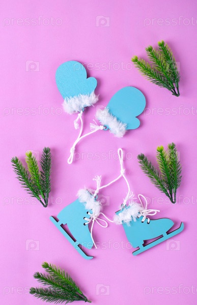 Зимняя квартира лежала с маленькими коньками и варежками на розовом фоне. Праздничные спортивные мероприятия