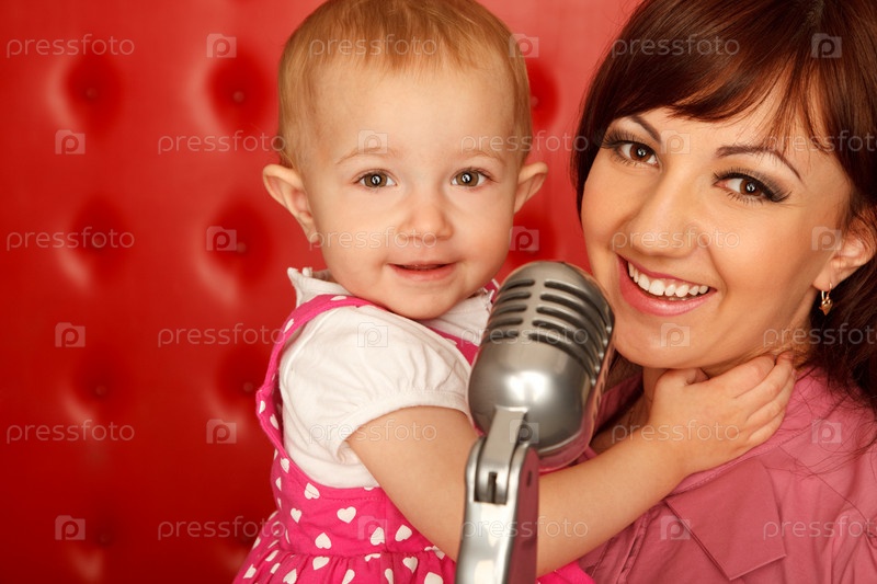 Портрет матери и дочки с микрофоном на стойке