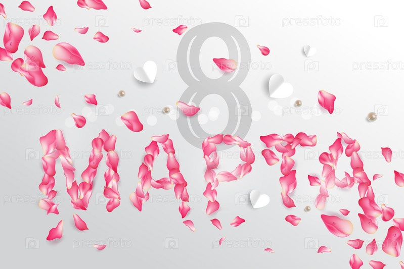 8 марта - Русская красивая надпись на русском языке. 8 марта рукописные надписи с нежными розовыми цветами, типографский векторный дизайн для поздравительных открыток и плакатов