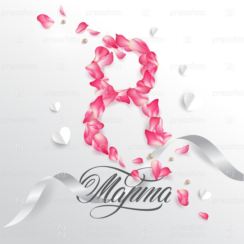 8 марта - Русская красивая надпись на русском языке. 8 марта рукописные надписи с нежными розовыми цветами, типографский векторный дизайн для поздравительных открыток и плакатов