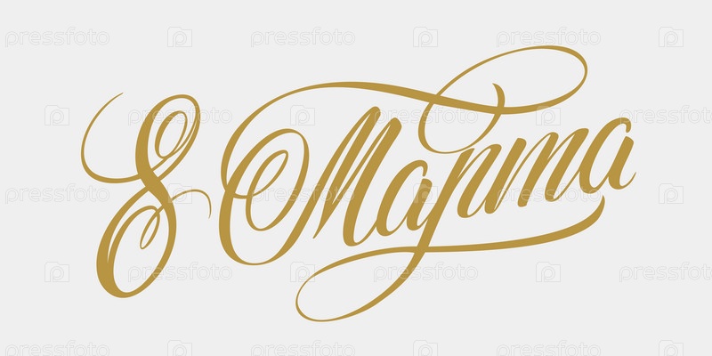 8 марта - Русская красивая надпись на русском языке. 8 марта рукописные надписи с нежными розовыми цветами, типографский векторный дизайн для поздравительных открыток и плакатов