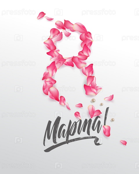 8 марта - Русская красивая надпись на русском языке. 8 марта рукописные надписи с нежными розовыми цветами, типографский векторный дизайн для поздравительных открыток и плакатов