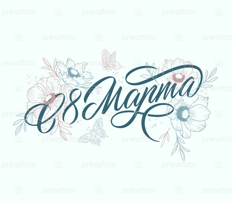 8 марта - Русская красивая надпись на русском языке. 8 марта рукописные надписи с нежными розовыми цветами, типографский векторный дизайн для поздравительных открыток и плакатов