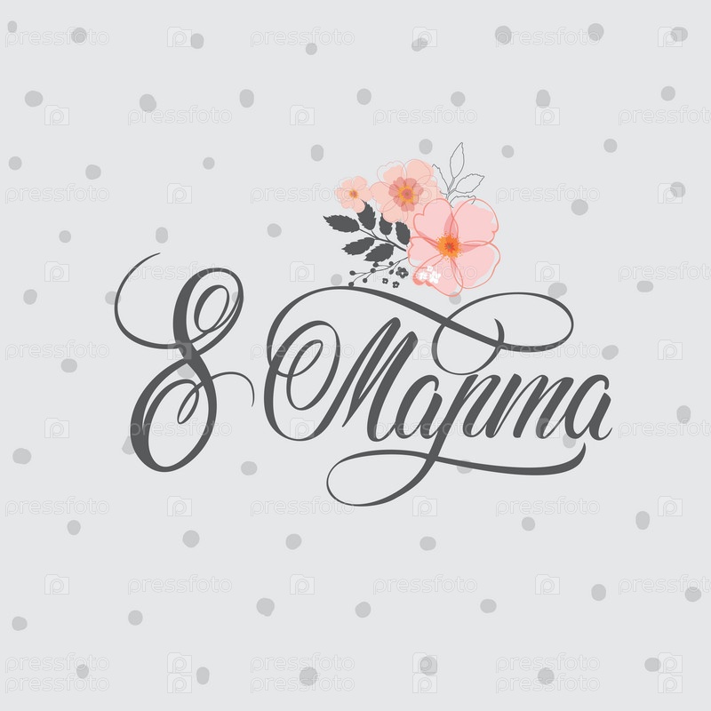 8 марта - Русская красивая надпись на русском языке. 8 марта рукописные надписи с нежными розовыми цветами, типографский векторный дизайн для поздравительных открыток и плакатов