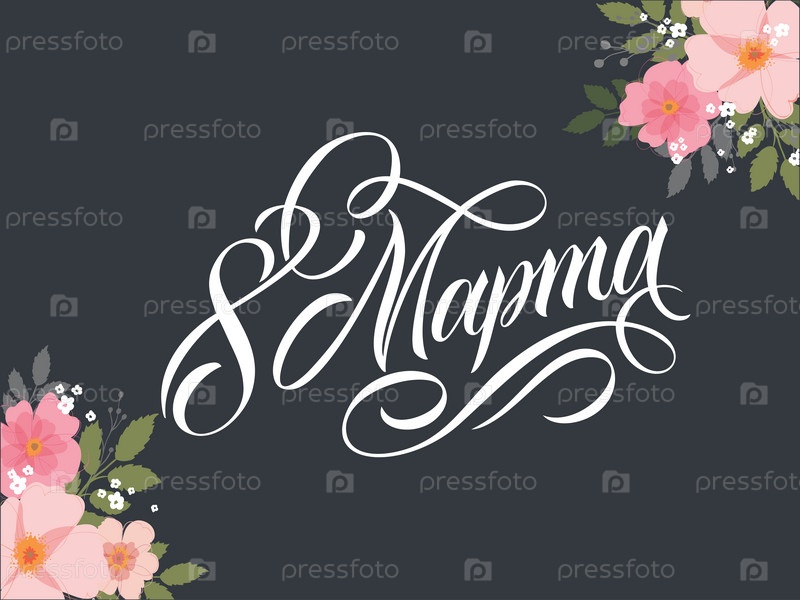 8 марта - Русская красивая надпись на русском языке. 8 марта рукописные надписи с нежными розовыми цветами, типографский векторный дизайн для поздравительных открыток и плакатов