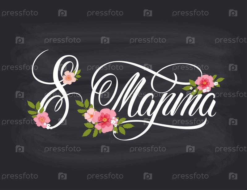 8 марта - Русская красивая надпись на русском языке. 8 марта рукописные надписи с нежными розовыми цветами, типографский векторный дизайн для поздравительных открыток и плакатов
