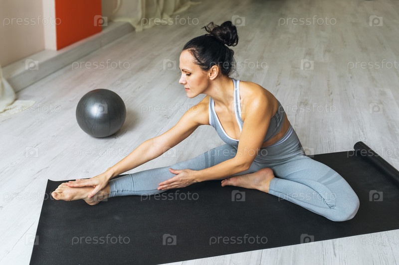 Женщина в спортивной одежде делает растяжку мышц лодыжки и ноги, сидя на коврике в студии