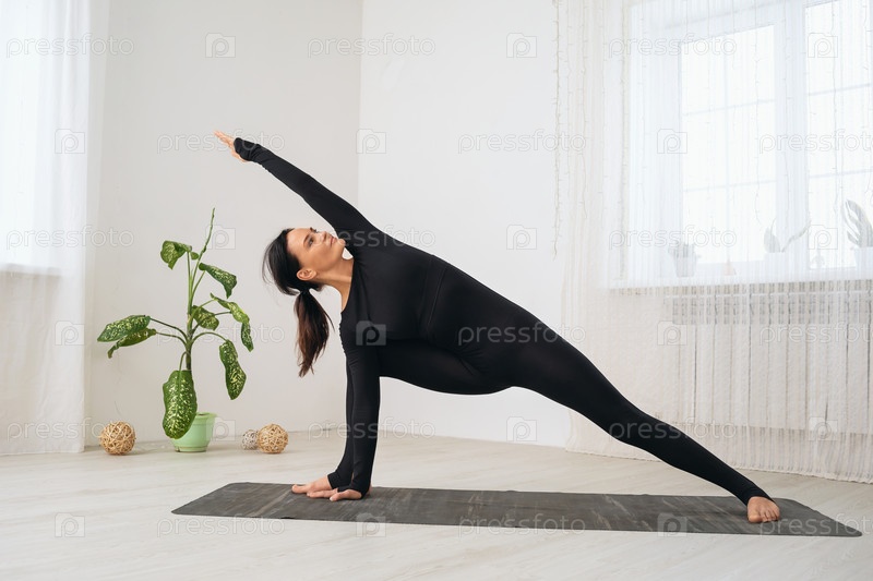 Женщина в черной спортивной одежде практикует йогу, делает вариацию упражнения Уттхита Паршваконасана, угловая поза с интенсивным боковым растяжением, тренируется в комнате на коврике