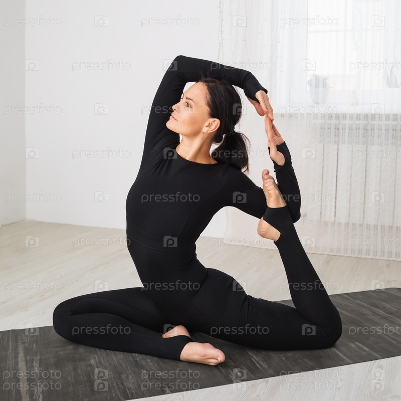 Женщина в черной спортивной одежде, практикующая йогу, выполняет вариацию упражнения Эка Пада Раджакапотасана, поза голубя, тренируется, сидя на коврике в пустой светлой комнате