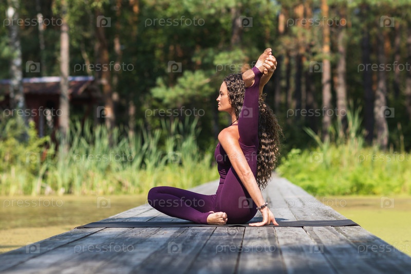 Женщина, ведущая здоровый образ жизни и практикующая йогу, выполняет вариацию упражнения янтрасана, позу компаса, тренируется в спортивной одежде в парке, сидит на деревянном мосту
