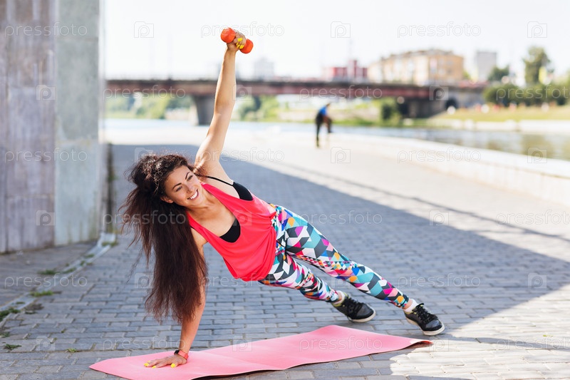 Молодая женщина выполняет упражнения с гантелями на набережной солнечным летним утром. Концепция здорового образа жизни