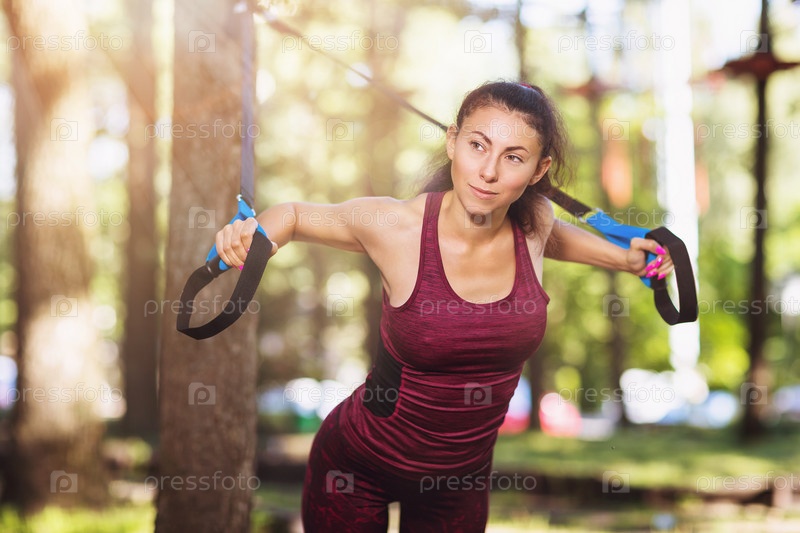 Молодая женщина делает упражнения в парке с фитнес-ремнями, прикрепленными к дереву. Спортсмен тренирует мышцы груди теплым летним утром