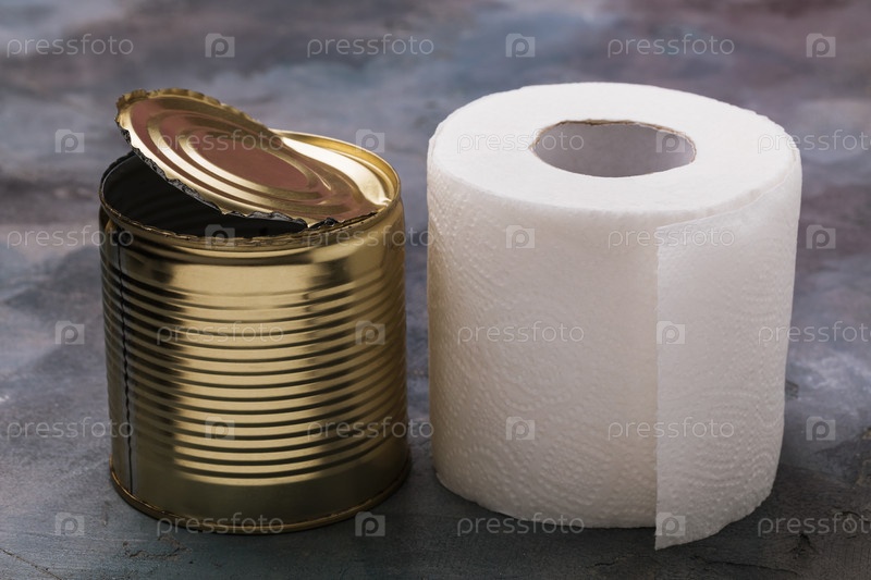 Открытая консервная банка и рулон туалетной бумаги на столе. Концепция на тему пищевого отравления
