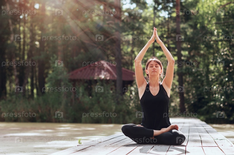 Женщина медитирует в позе лотоса с поднятыми руками на деревянной дорожке летним солнечным утром