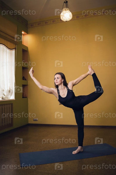 Привлекательная женщина в черной спортивной одежде в полный рост, практикующая йогу в студии, выполняющая упражнения натараджасана, поза короля танцоров