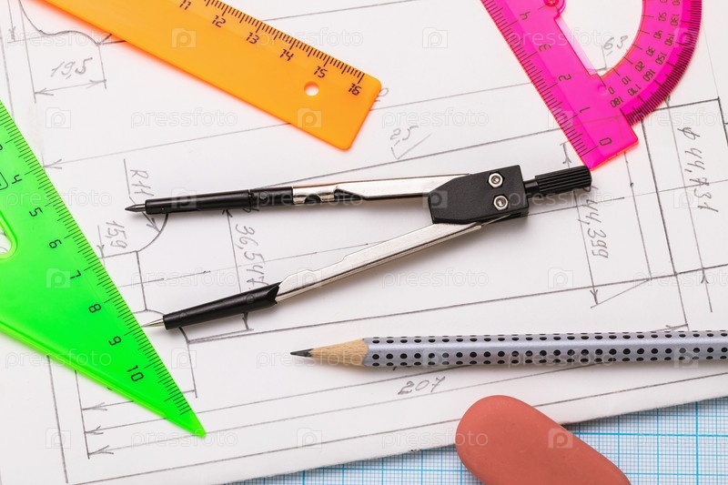 Различные инструменты для рисования на бумаге с чертежами, вид сверху