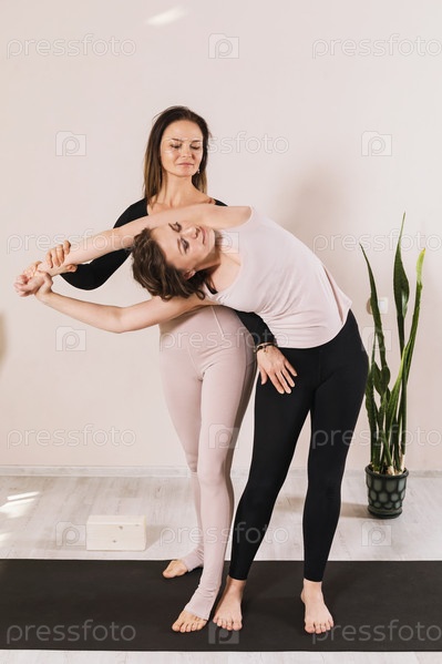 Две красивые женщины в спортивной одежде, практикующие йогу, выполняют упражнения на боковой наклон, стоя у стены. Концепция на тему личного обучения