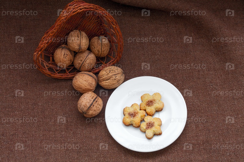 Плетеная корзина с орехами и печенье на тарелке